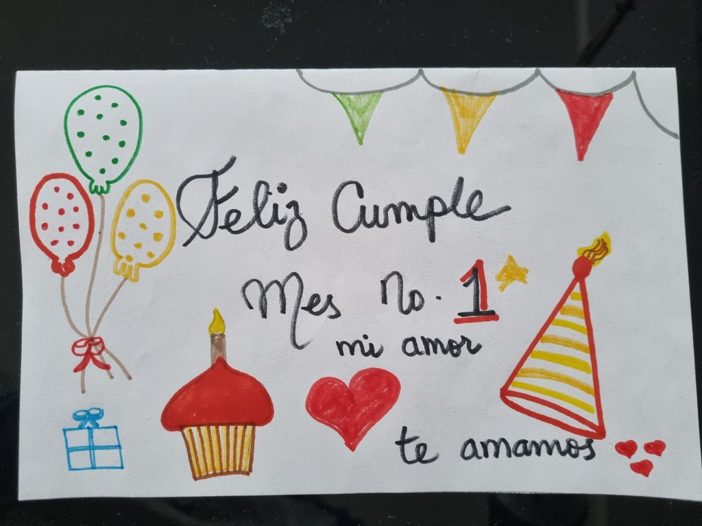 A pesar de las recaídas, Josecito cumplió su primer mes de vida. Lo celebramos como si fuera su cumpleaños. Le hicimos un cartel, le colocamos unas pantuflas de dinosaurio que le regaló su tía karina, una batita verde que le regaló una enfermera, y por un instante, vimos brillar su esencia más allá de las máquinas. Recordando con mucho amor se cumplía un mes de su llegada y cumplíamos un mes de ser sus papás. Mi esposa no tiene la habilidad de dibujar, no es su fortaleza, pero el amor por Josecito la inspiró para hacer de ese momento especial y maternal.